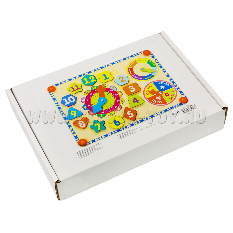 Фигуры расположены вокруг циферблата. С обозначением цифр от 1 до 12, разной формы и разных цветов. Поможет малышу познакомиться с геометрическими фигурами, развить логику, мелкую моторику. - Держатели-шарики по углам 4 шт.