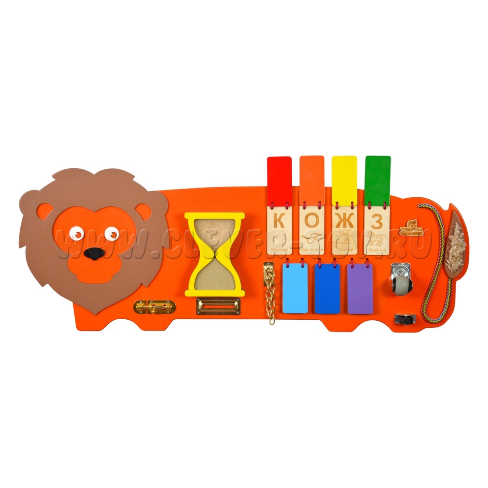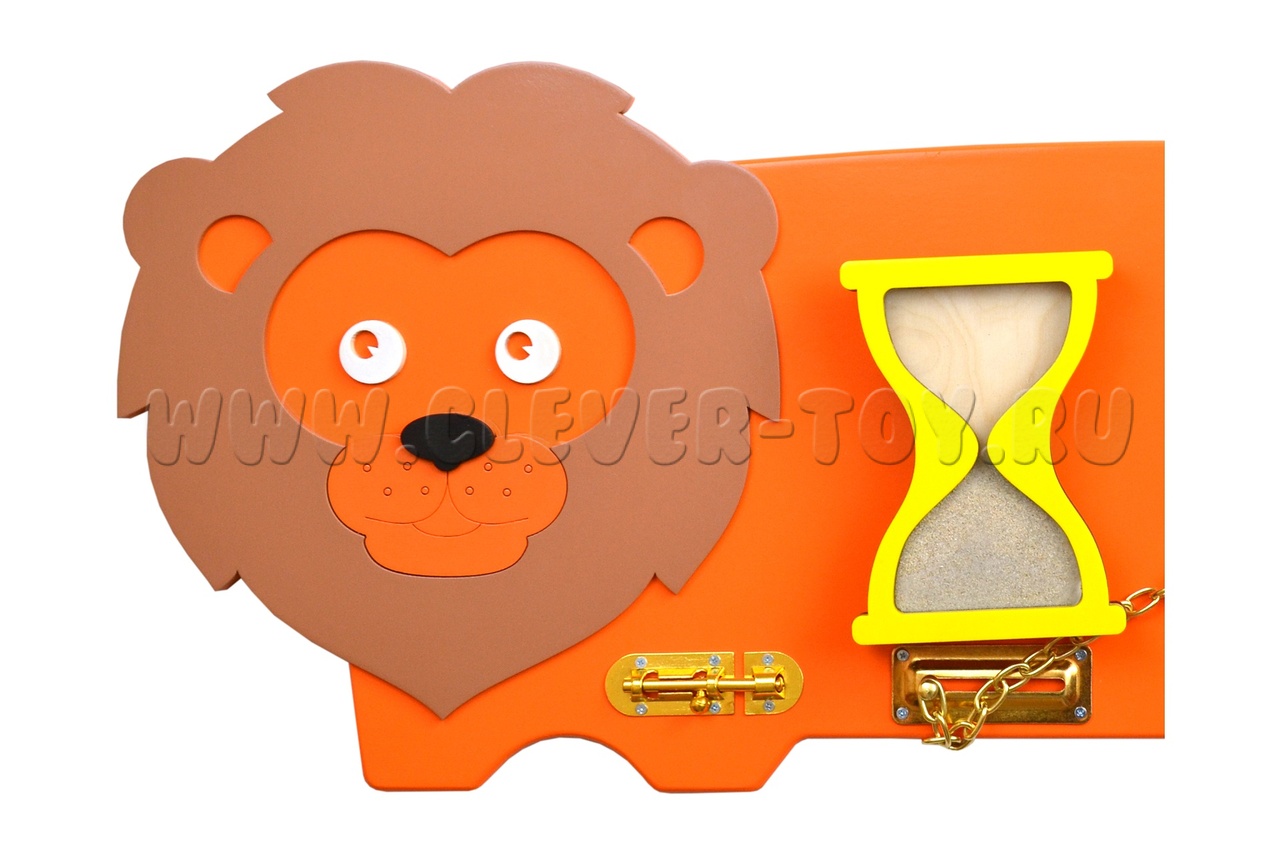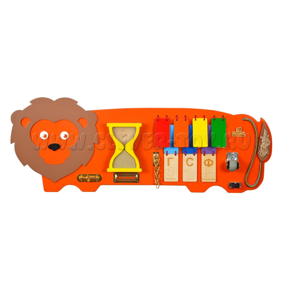 Детям свойственно познавать мир через окружающие его предметы, и чем больше интересных предметов будет в окружении малыша, тем лучше будет его развитие. Помочь в этом может наш бизиборд"Лев". Этот забавный представитель рода кошачьих станет лучшим другом для вашего малыша, ведь в этом бизиборде собрано столько полезных вещей для формирования интеллекта ребенка:
