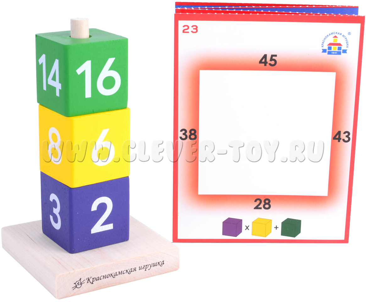 Правила игры на всех 3-х уровнях один - поставьте платформу со штырьком в центр карточки с заданием. Изпользуя 2,3 или 4 кубика тех цветов, которые изображены справа на карточке (в зависимости от уровня сложности). Ребёнку необходимо решить уравнение, то есть подобрать цифры на двух кубиках так, чтобы результаты сложения на всех 4-х сторонах башни совпали со значением на карточке.