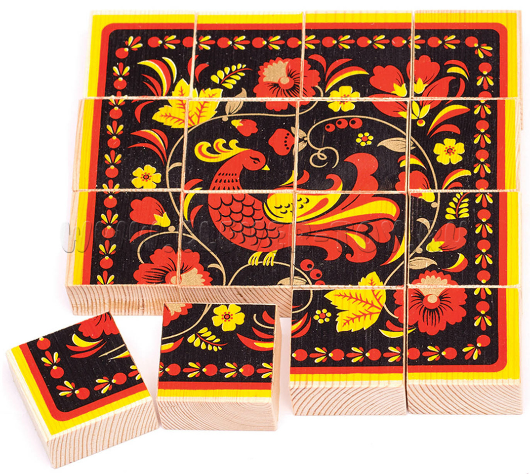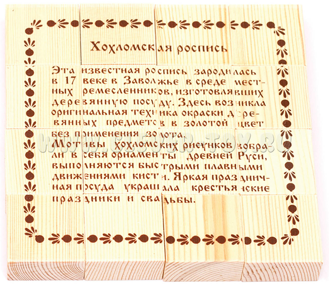 На оборотной стороне кубиков написана история Хохломской росписи. Прочитайте ее ребенку, найдите другие примеры росписи в быту, сувенирах, на иллюстрациях книг.
