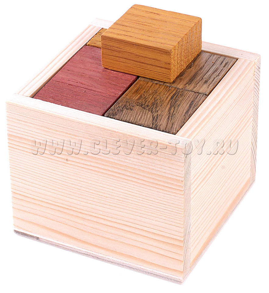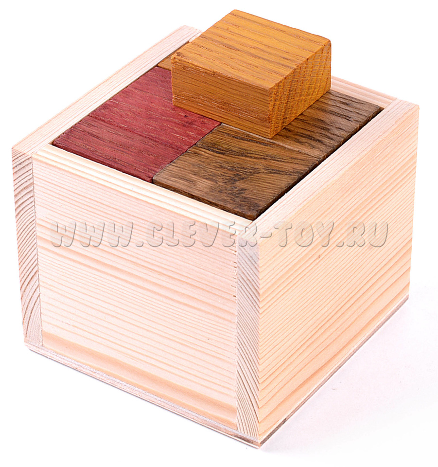 Гала куб состоит из 8 элементов и деревянной коробочки. Перед вами стоит две задачи. Сначала – упаковать все 8 элементов внутрь. А затем достать их выложить крест по толщине, равный ребру кубика.