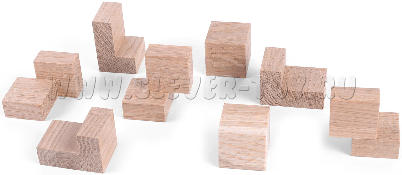 Гала куб состоит из 8 элементов и деревянной коробочки. Перед вами стоит две задачи. Сначала – упаковать все 8 элементов внутрь. А затем достать их выложить крест по толщине, равный ребру кубика.