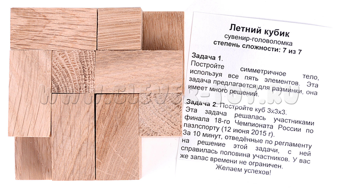 Вторая часть задачи заключается в построении куба, используя опять все элементы. Это задание уже под силу самым смекалистым людям. Погрузитесь в мир интересных логических задач вместе “летним кубиком”.