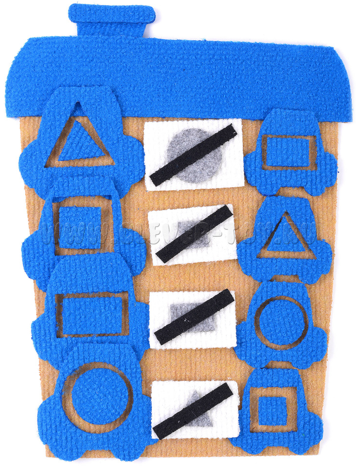 - карточки для геометрических фигур 8 штук, карточки с отрицанием ("не такая, как") 8 штук.