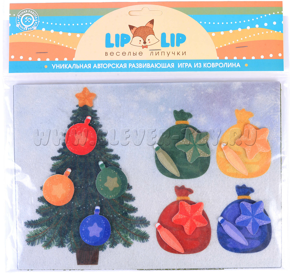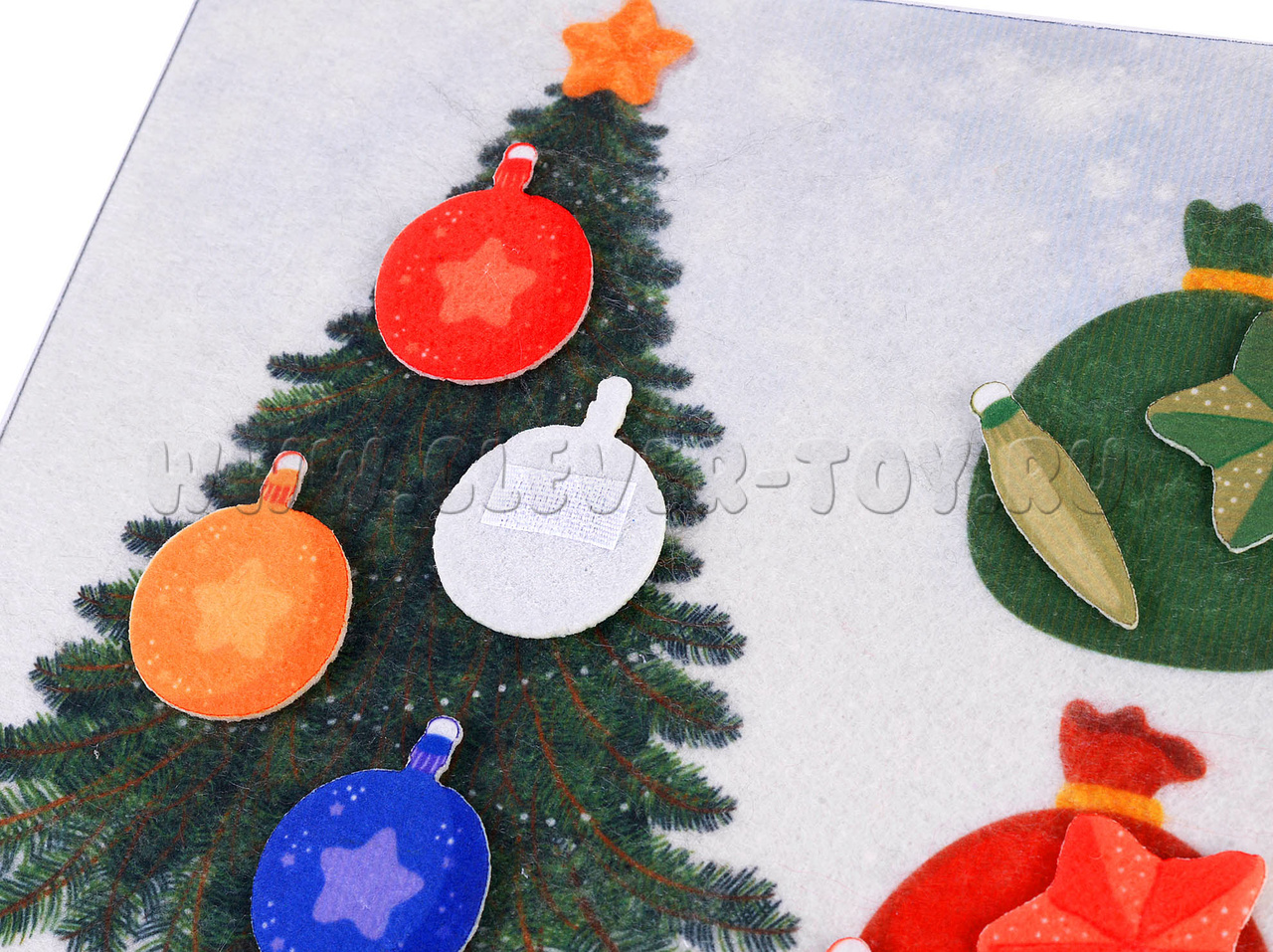 У каждой фигурки сзади есть липучка, при помощи которой можно размещать их на игровом поле. Ребенок может поместить игрушку на елку или распределить в мешочек по цвету.