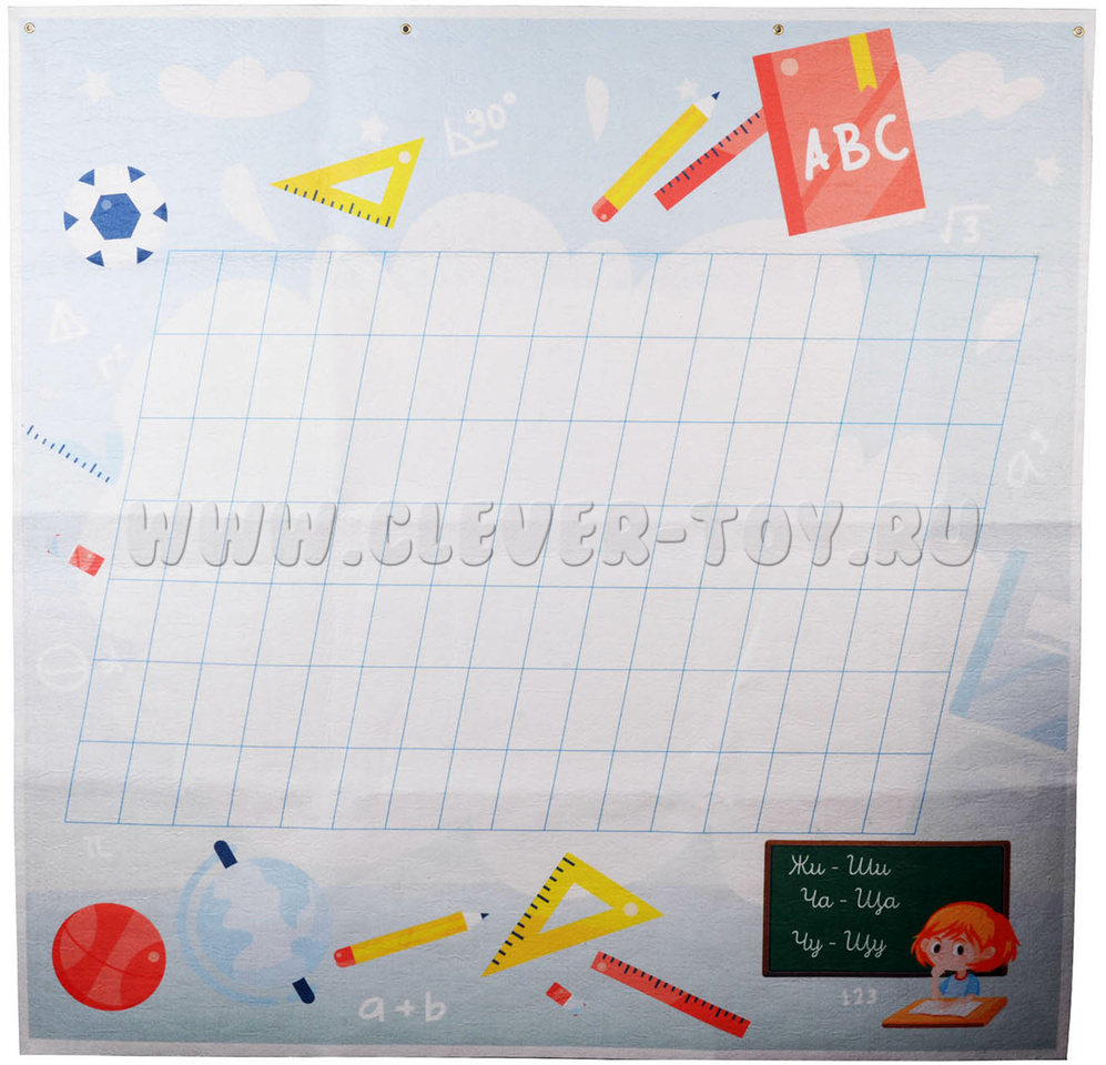В упаковке находится большое игровое панно с нанесёнными на него клетками под нужным наклоном, что поможет детям в игровой форме познакомиться с понятиями «Печатные» и «Прописные» буквы. В дальнейшем – в начальной школе – ребёнок будет готов к прописям. Вокруг клеток также есть изображения различных школьных атрибутов, маленькая школьная доска с первыми и важными правилами русского языка: «Жи-ши, Ча-ща, Чу-щу».