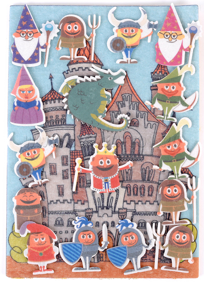 • 16 фигурок героев, выполненных в мультипликационном стиле: король, королева, звездочёт, дракон, забавные рыцари и стражники, которые держат в руках разное оружие;