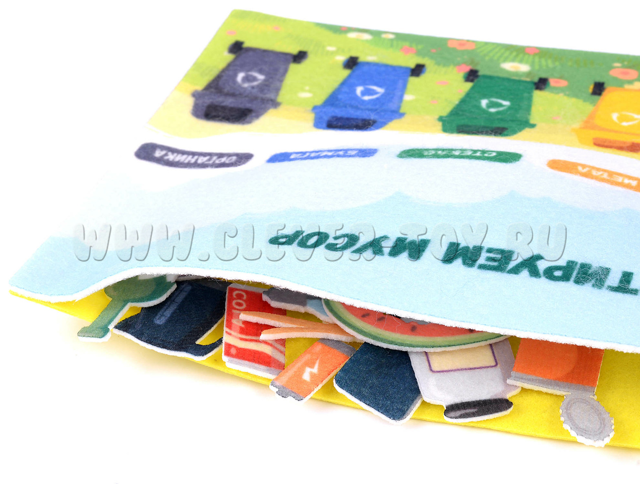 В наборе вы найдёте 31 фигурку, выполненную из мягкого и приятного на ощупь материала — фетра. Каждая фигурка представляет собой определённый вид мусора: бумага, пластик, стекло, органические отходы и т. д. Фигурки крепятся к игровому полю с помощью липучек, что позволяет детям легко и безопасно сортировать их.