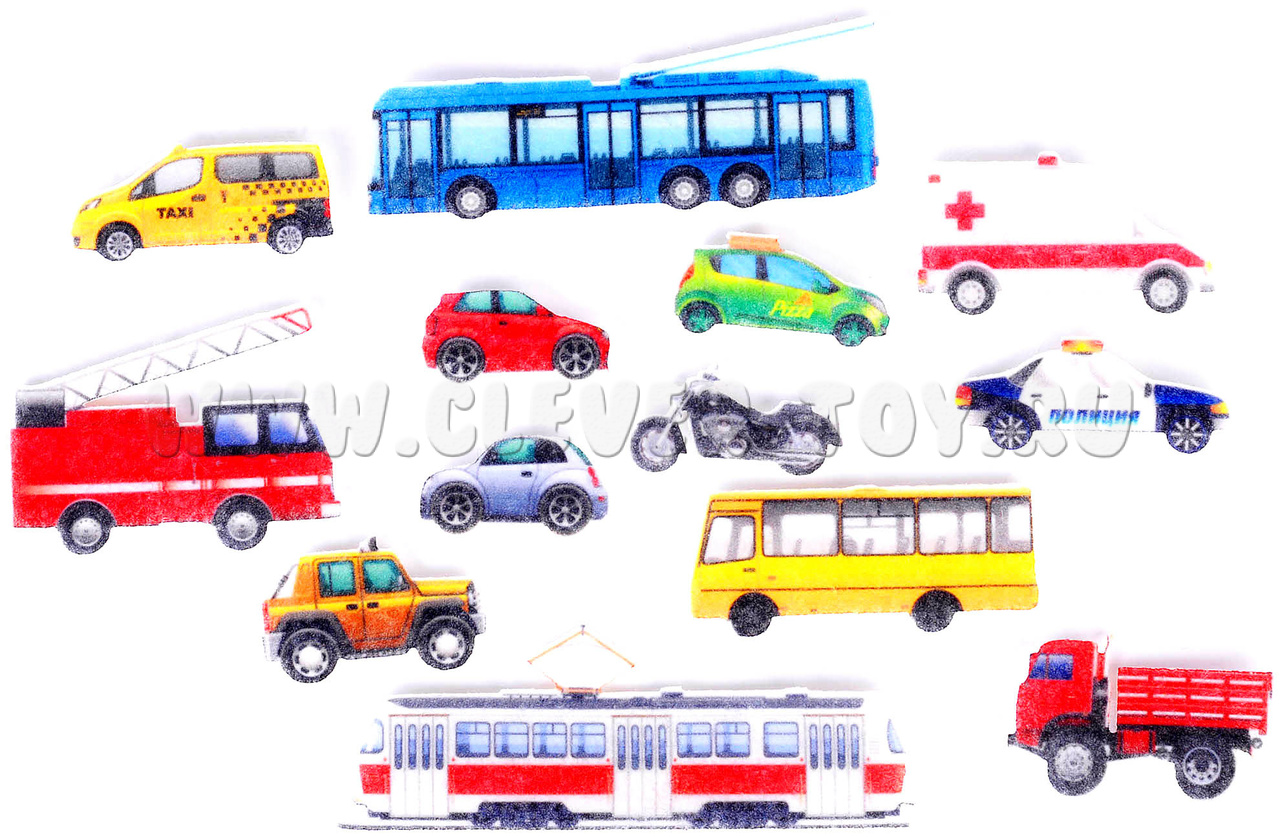 - 13 фигурок машинок и общественного транспорта: легковые и грузовые автомобили, трамвай, троллейбус, полицейская машина, пожарная машина, скорая помощь, автобус, такси;