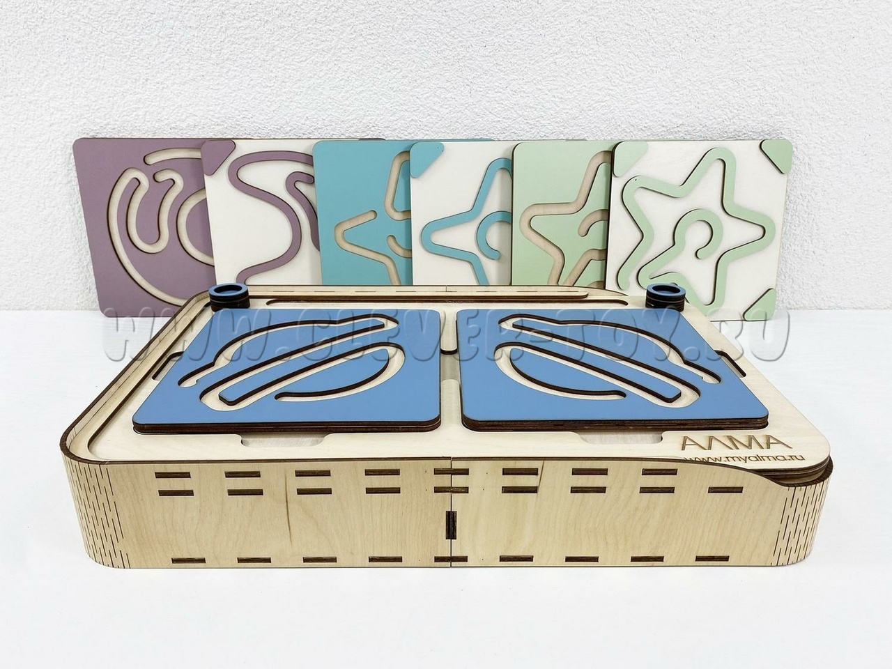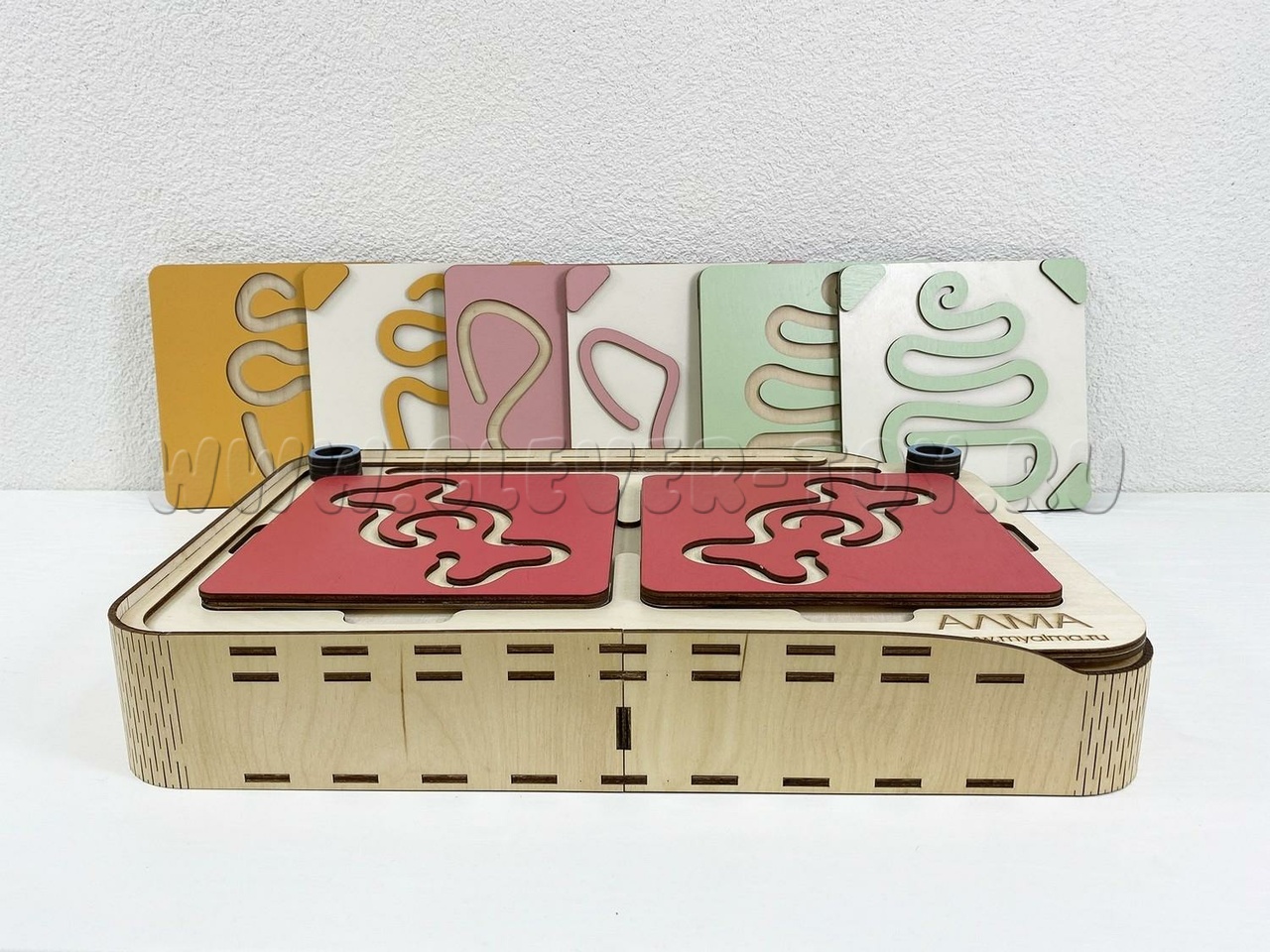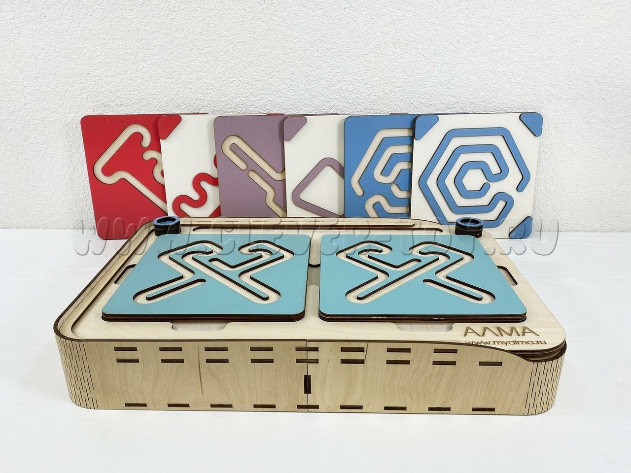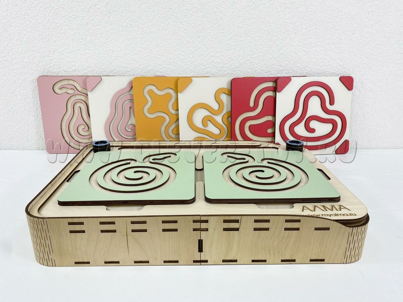 Состоит из основания в виде коробки и разноцветных лабиринтов-вкладышей.