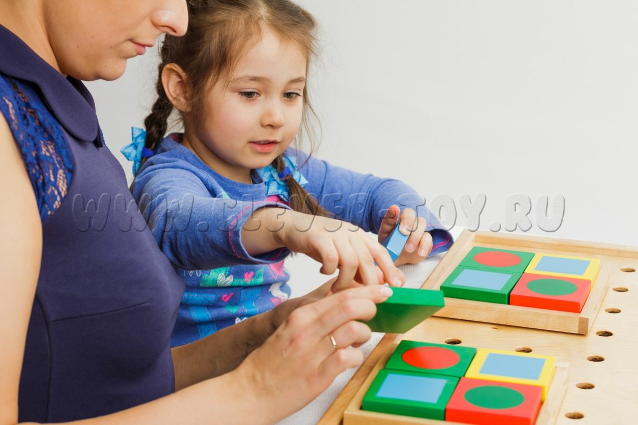 100 фигур (квадраты, треугольники, прямоугольники) 4 цветов и разных размеров. Ребёнок складывает из них другие фигуры и изображения (дома, машины), учится сравнивать, находить общее/различное. Тренирует моторику.