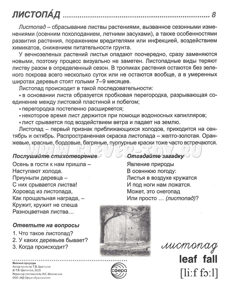 Для лучшего запоминания материала в комплекте есть оригинальные стихотворения и рифмованные загадки на эту тему, а также вопросы для обсуждения. Название каждой статьи переведено на английский язык и имеет транскрипцию.