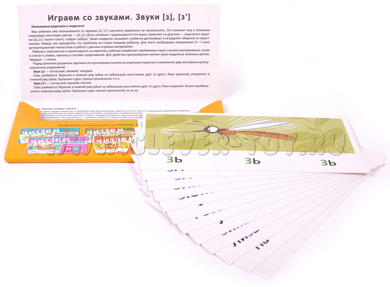 Это издание предназначено для обучения детей чтению в возрасте от 4 до 7 лет и включает в себя 12 обучающих картинок, состоящих из 36 карточек и 4 увлекательных игр. Оно является продолжением тематического комплекта "Играем со звуками. Звуки [с], [с']".