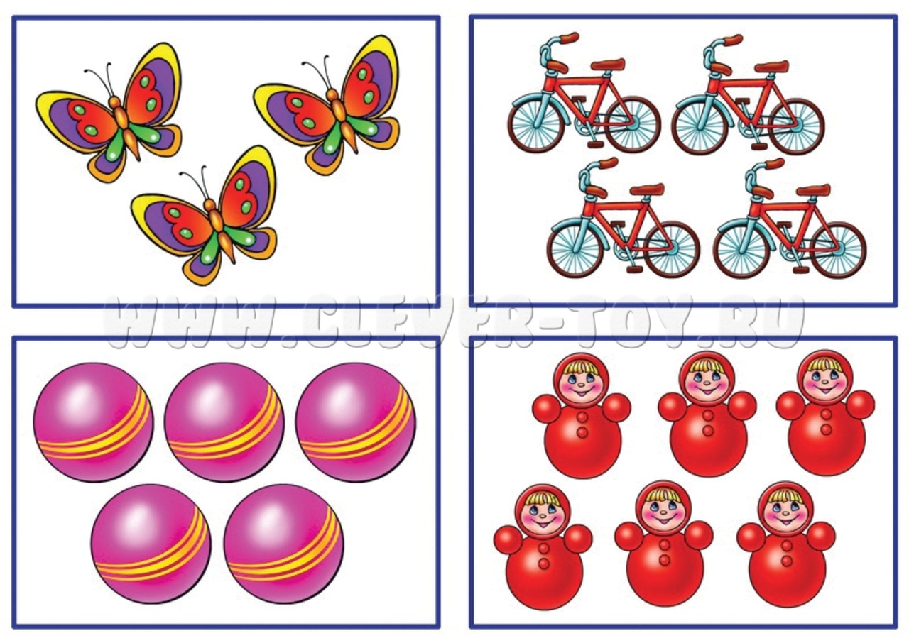 - Предложите детям к карточке с цифрой подобрать карточки с предметами и точками, количество которых соответствует обозначенной цифре;