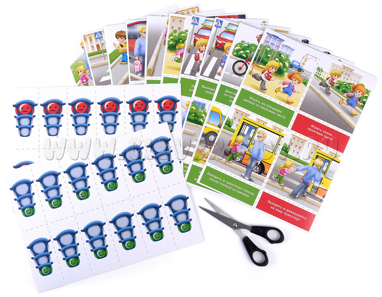 Перед началом игры необходимо разрезать карты по пунктирным линиям. В результате получится 40 карточек с сюжетными картинками (20 пар карточек), 40 карточек с надписями и 24 карточки со светофорами.