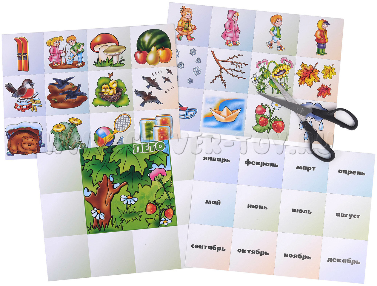 Перед началом игры родителю или педагогу необходимо разрезать карточки по пунктирным линиям. Большие карты (игровые поля) раздайте участникам поровну. 32 маленькие карточки с картинками перемешайте и выложите отдельно изображением вниз, так же поступите с карточками с названиями месяцев. По команде участники начинают выбирать из маленьких карточек подходящие к их игровым полям. Побеждает тот, кто сделал это правильно и быстрее всех остальных.