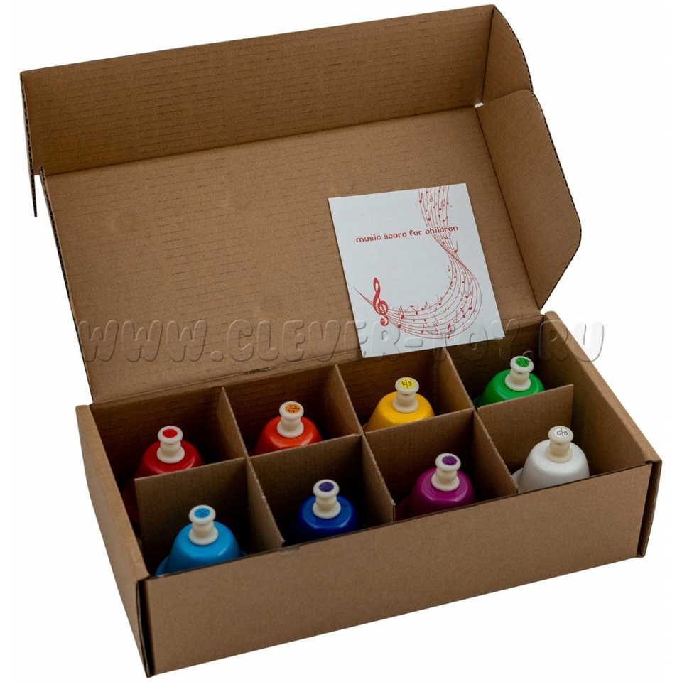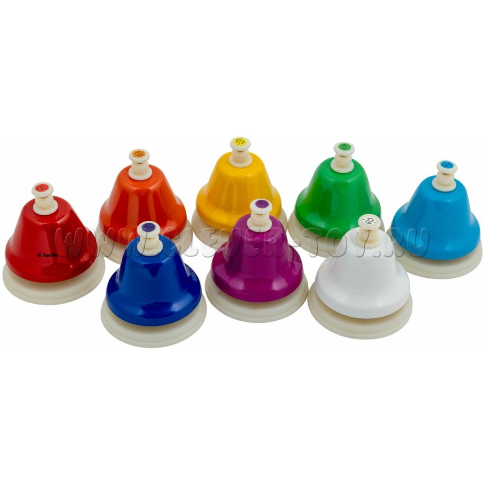 8 колокольчиков на подставках, ноты: до (C), ре (D), ми (E), фа (F), соль (G), ля (A), си (B), до (C')