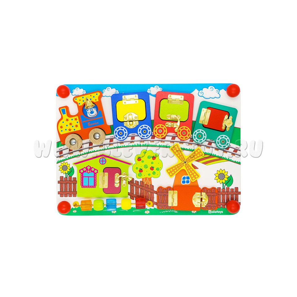 Бизиборд «Вагончики» от крупнейшего производителя деревянных игрушек – фабрики «Алатойс» - выполнен из экологически чистого материала – дерева (берёза).