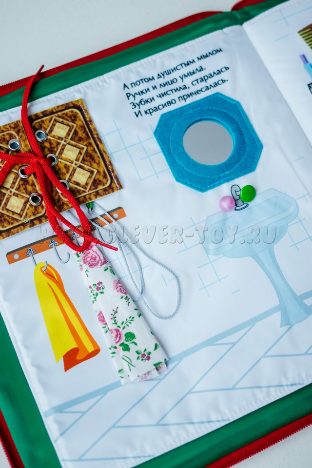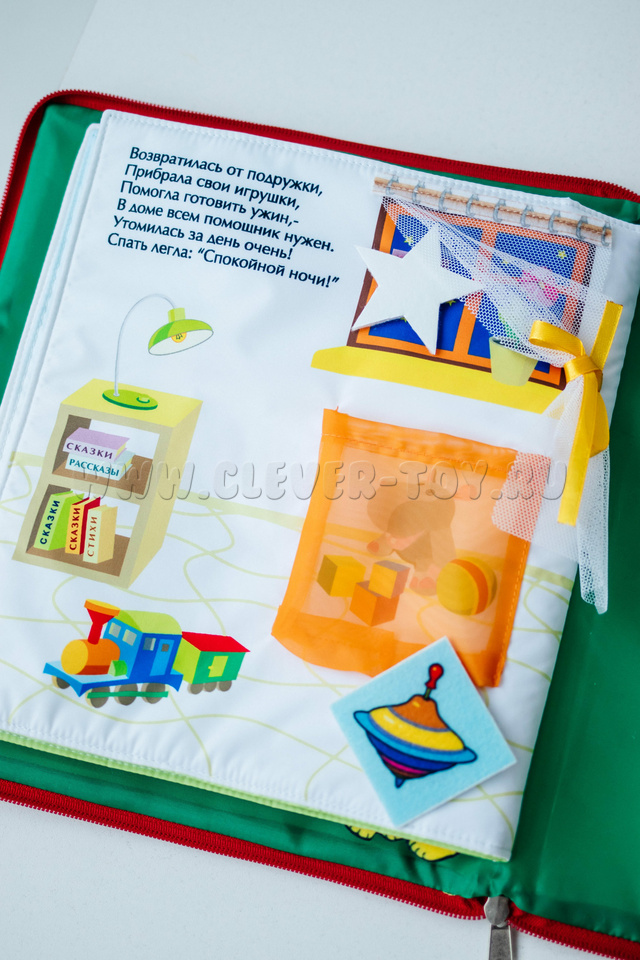 В книге есть дополнительные элементы для интересных игр: сама Маша, её одежда (халат, юбка, штаны, куртка) и кошка, которая живёт с ней.